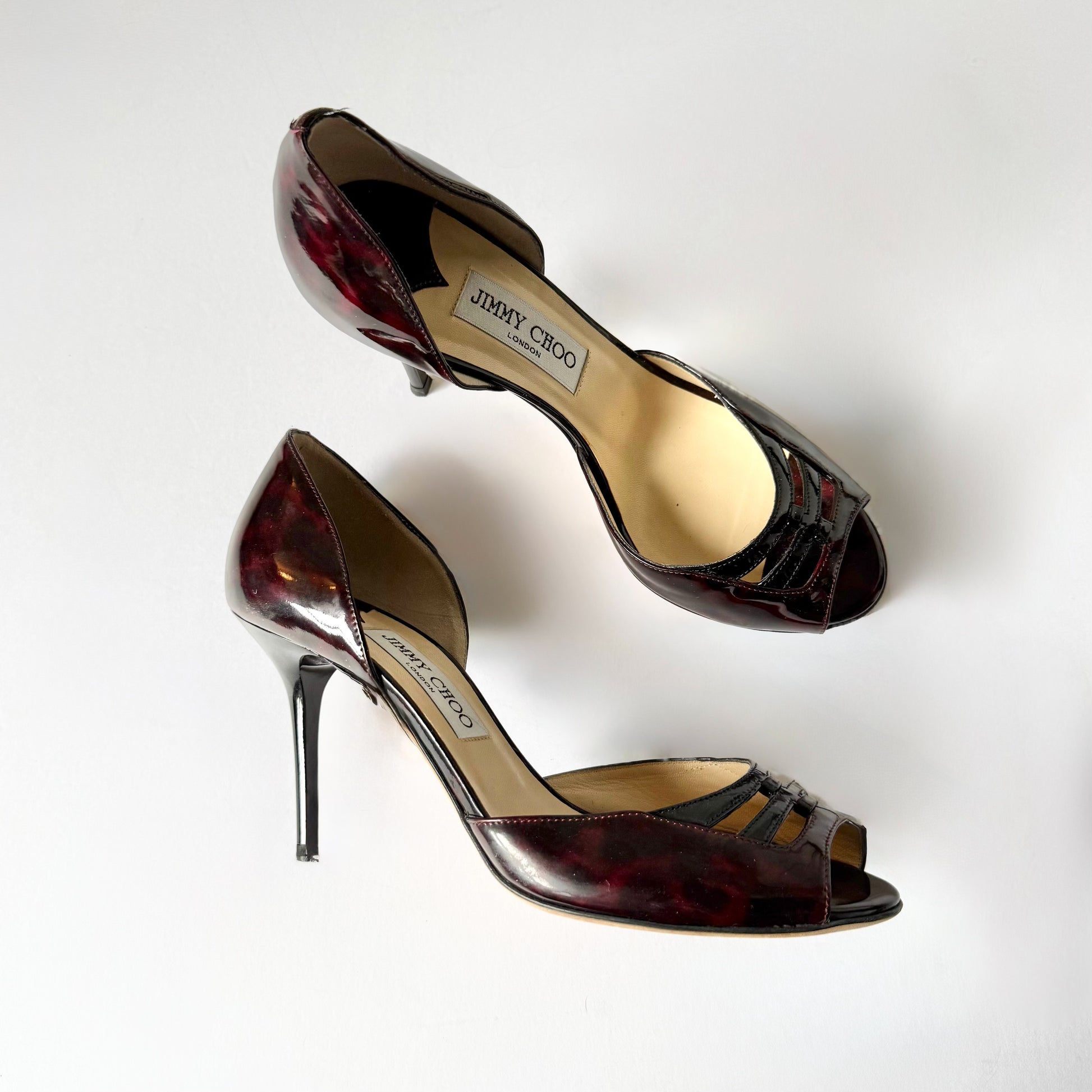 Jimmy Choo D’Orsay patent leather heels in a cherry red cheetah print The perfect holiday heels. Cherry red open toe heels - they do look almost black in some lighting but have a subtle cheetah / tortoise shell pattern