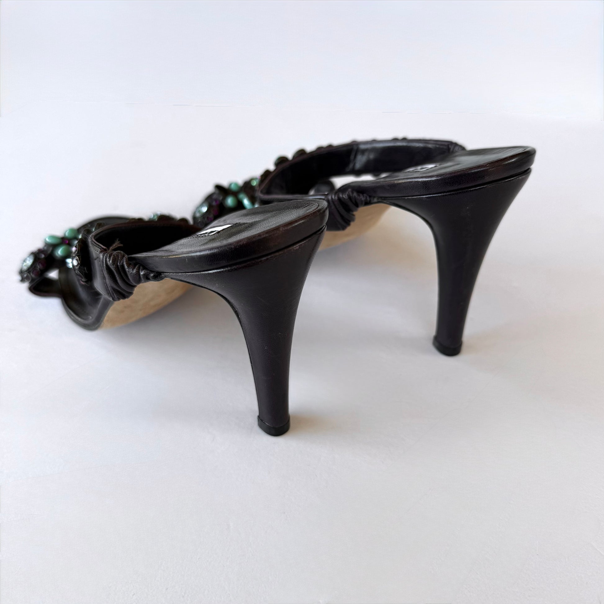 early 2000’s vintage Manolos in a dark plum/brown leather and turquoise beaded embellishment detail. A few of the stones are missing but doesn’t take away from the design IMO <3