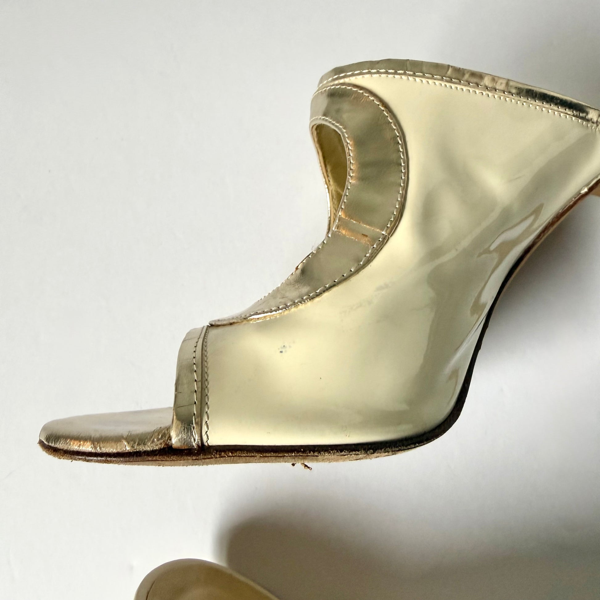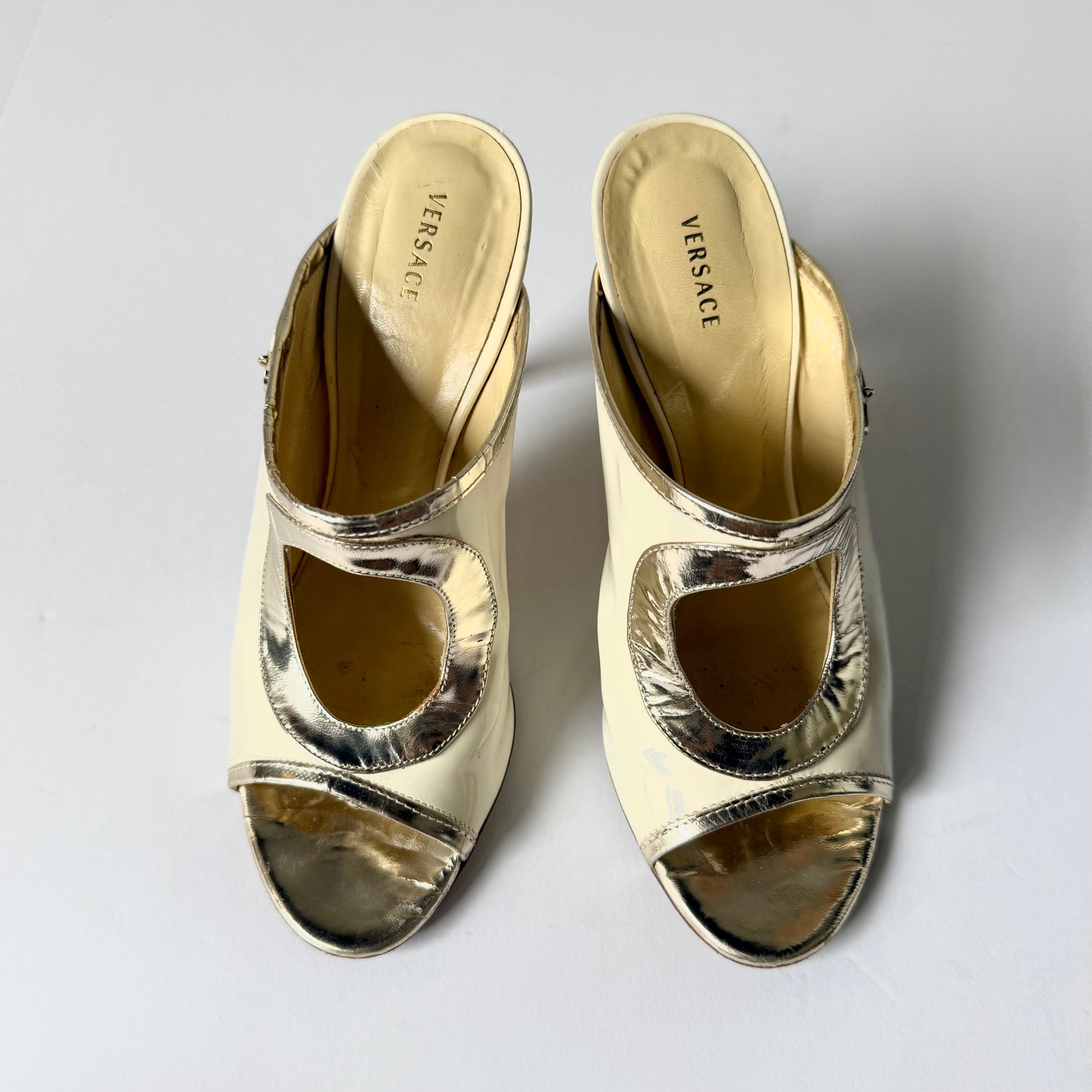 Absolutely gorgeous vintage Versace ivory patent leather heels with metallic detail. The perfect bridal / bachelorette party heels for an iconic bridal the leather has wear and discoloration but super normal for vintage patent leather