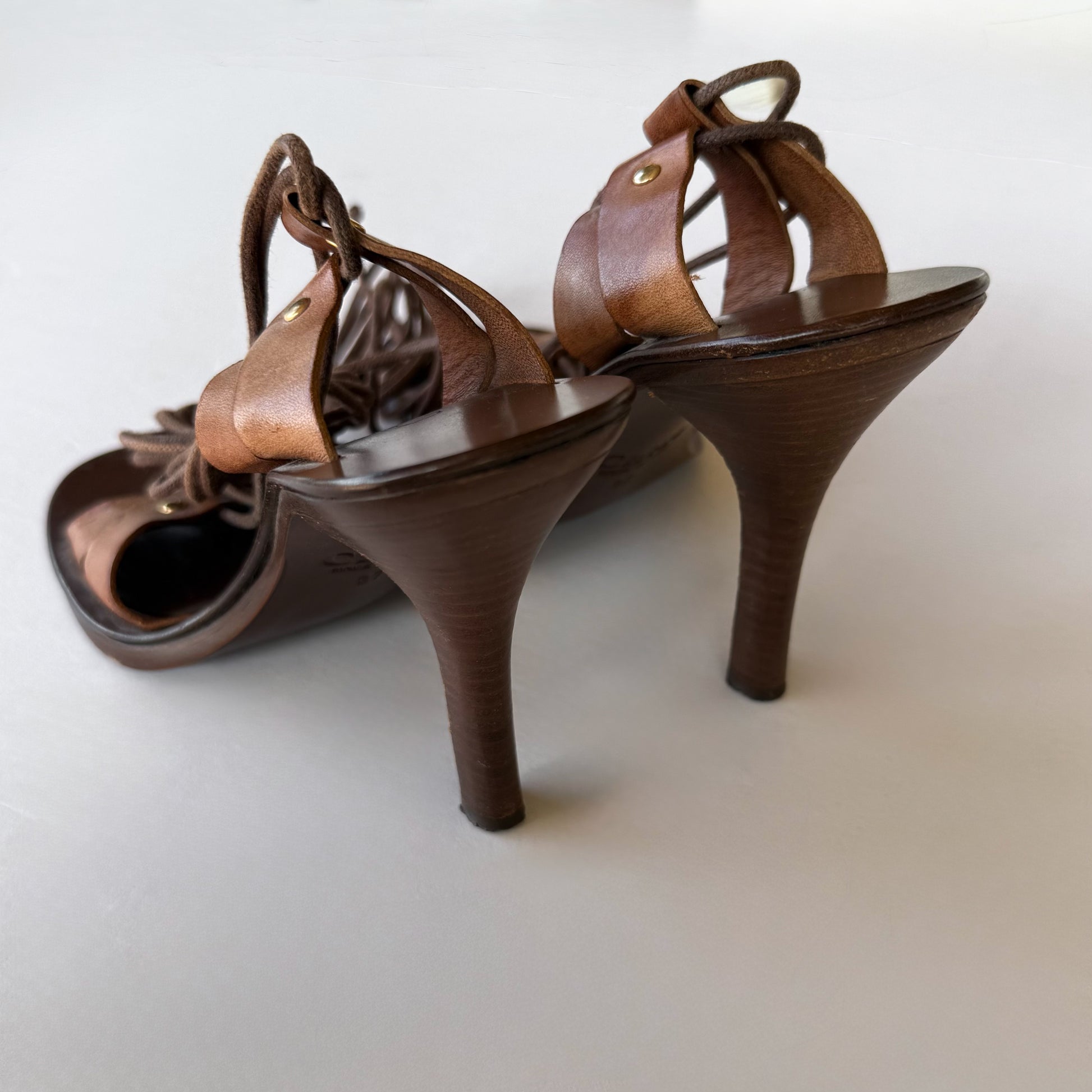 Chloe Spring Summer 2003 brown leather lace up sandal heels with adjustable ties. In excellent condition. Some small marks and dents on leather.