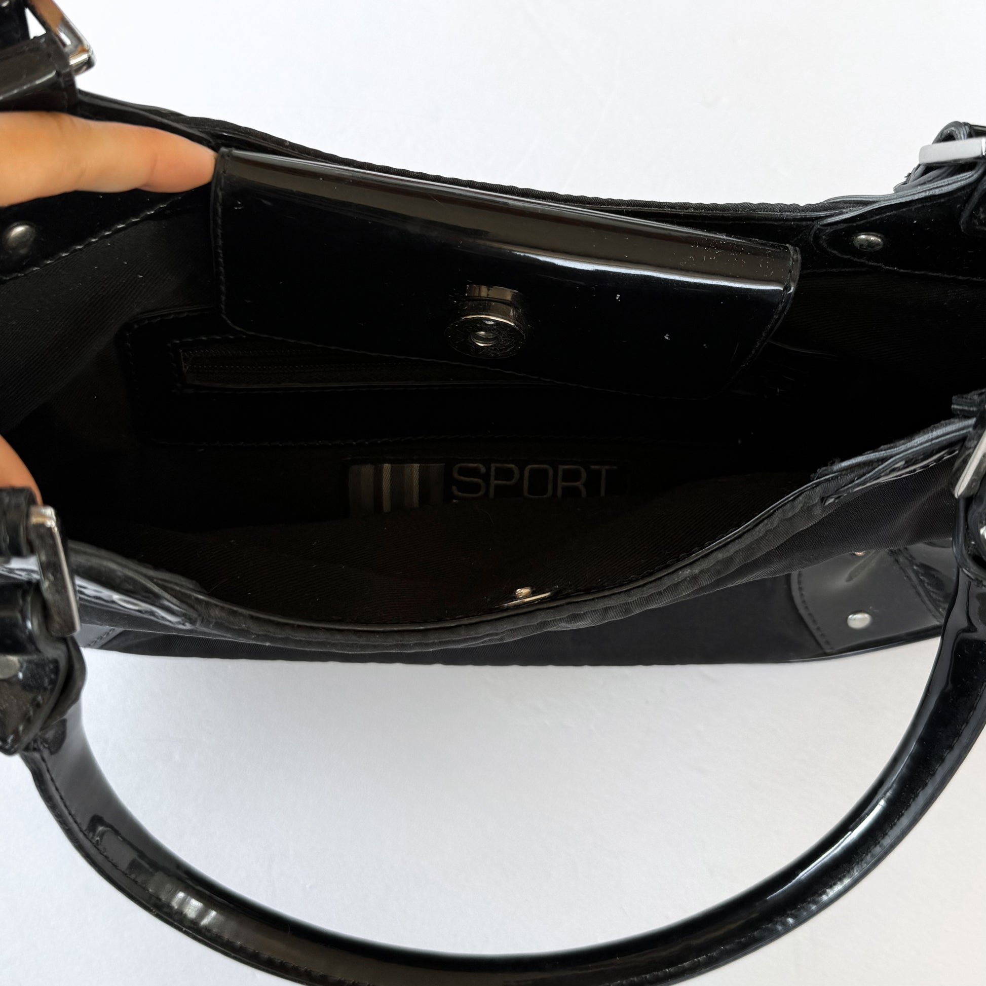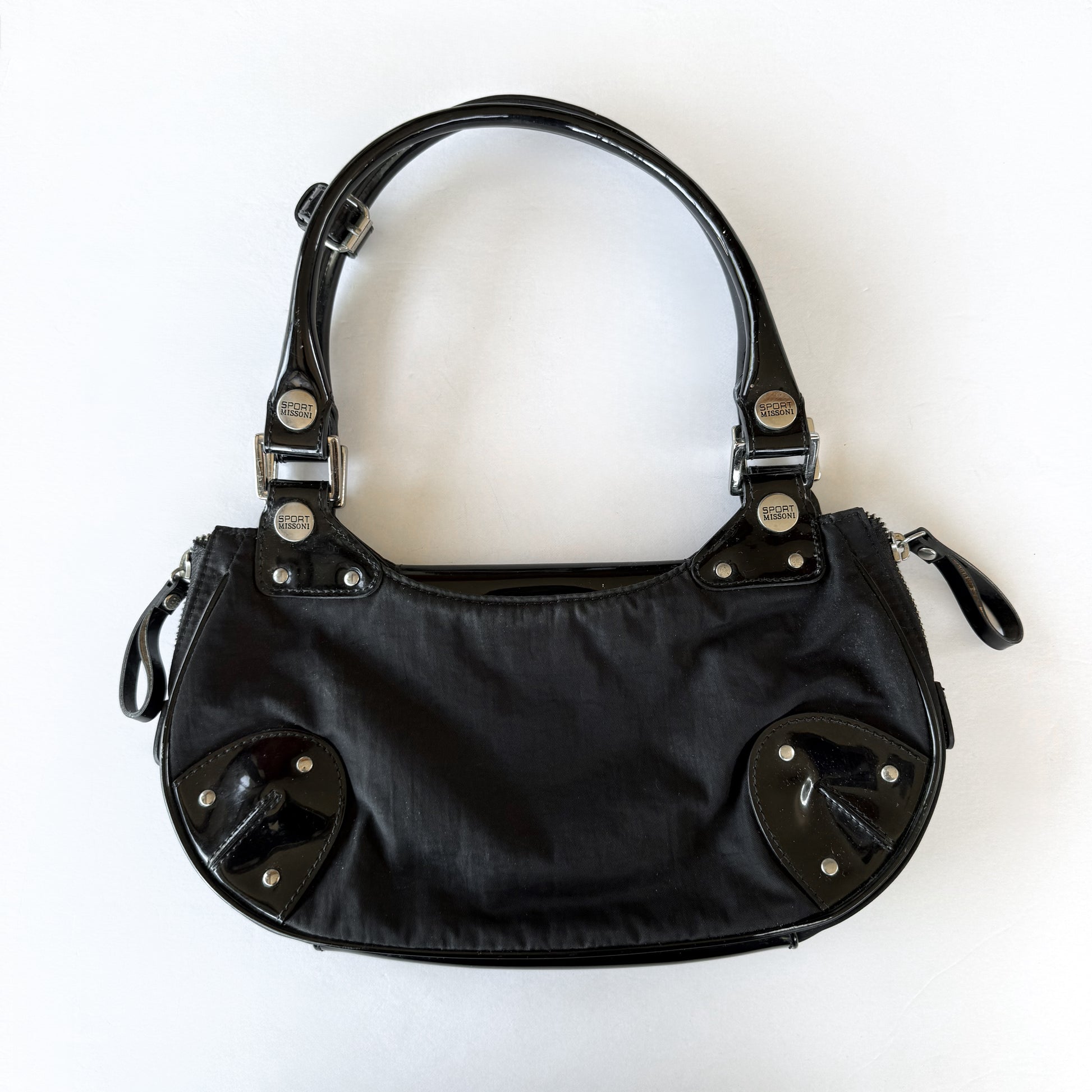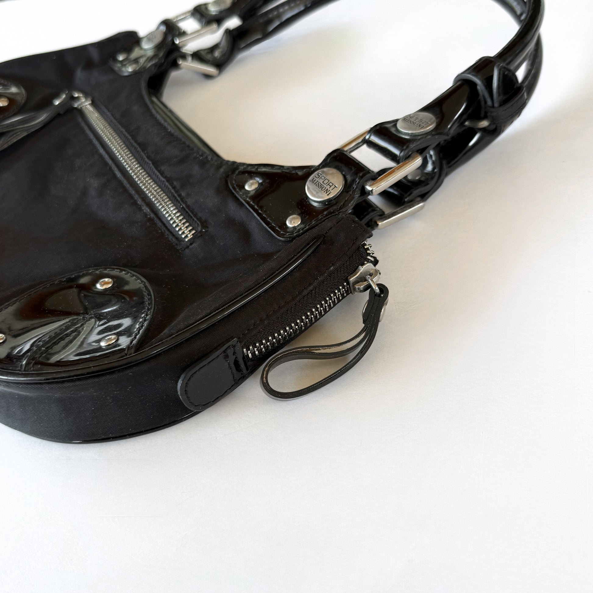 Early 2000’s vintage Missoni Sport nylon shoulder bag with patent leather detail and silver studs. cute little festival or going out bag